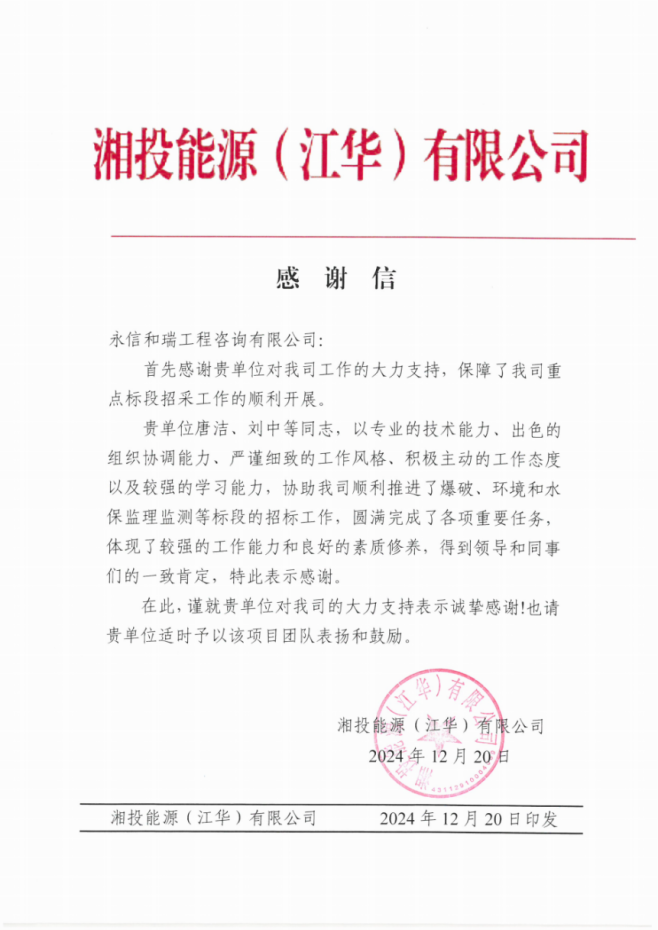 近期,我司造價咨詢事業部劉中、唐潔等同事協助湘投能源(江華)有限公司(以下簡稱“江華公司”)順利推進了湖南江華灣水源抽水蓄能電站爆破、環境和水保監理監測等標段的招標工作,在圓滿收官同時,也收獲了來自江華公司的認可與感謝。