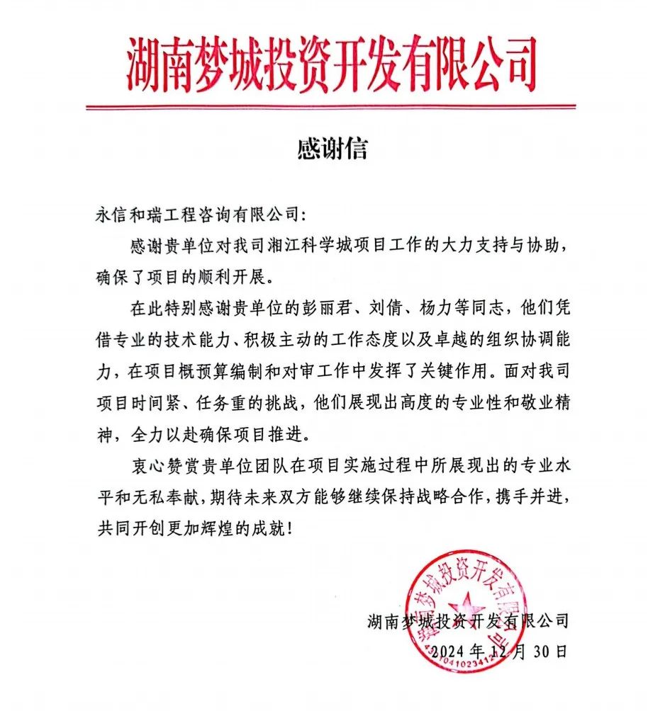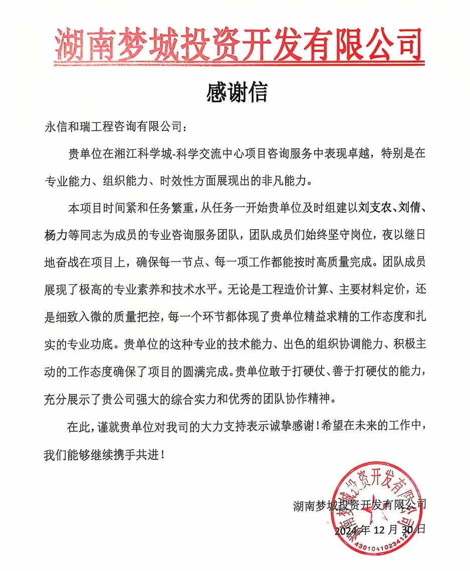 自2024年7月起,我司造價事業部的劉支農、彭麗君、劉倩及楊力等同事,在湘江科學城科技服務中心、交易展示中心的目標成本和預算,以及科學交流中心的概算和模擬清單咨詢服務中表現出色。他們憑借扎實的專業知識、卓越的技術水平和緊密的團隊合作,贏得了湖南夢城投資開發有限公司的高度評價。