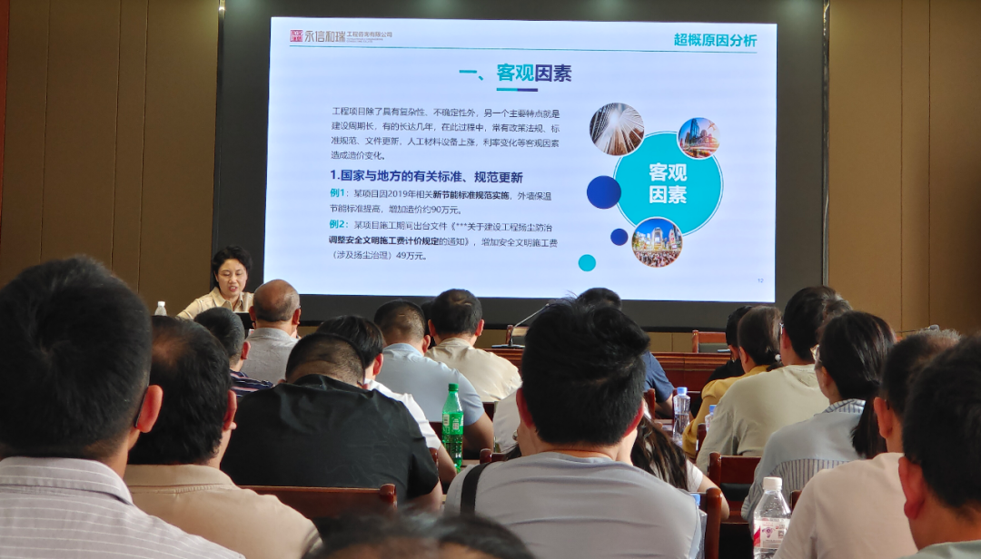 培訓由永信和瑞項目管理咨詢部總經理黃浩浩主講。她以“政府投資項目超概原因分析及控制措施”為主題,結合豐富的案例和翔實的數據,從多個角度抽絲剝繭,深入分析了導致超概的原因。她指出,因工程項目的不確定性,超概原因既有客觀層面的,但更多是因缺乏整體管控思路、管理不善造成的。接著,黃總進一步從監管層面和操作層面提出了多項控制措施。她認為,對于政府層面而言,有必要出臺詳細的、切實可行的政策文件,用以規范管理、壓實各方責任;對于建設單位而言,必須在整體管控的框架下開展工作,作為游戲規則的制定者,要將主動權把握在自己手上。最后,黃總提出,讓所有的參建單位均以實現項目增值為目的,共同確定和追求項目的整體目標,確保參建各方都能獲取應有的利益,共創多贏局面,實現正和博弈,這便是我們作為咨詢人的使命,贏得了在場學員的高度評價。