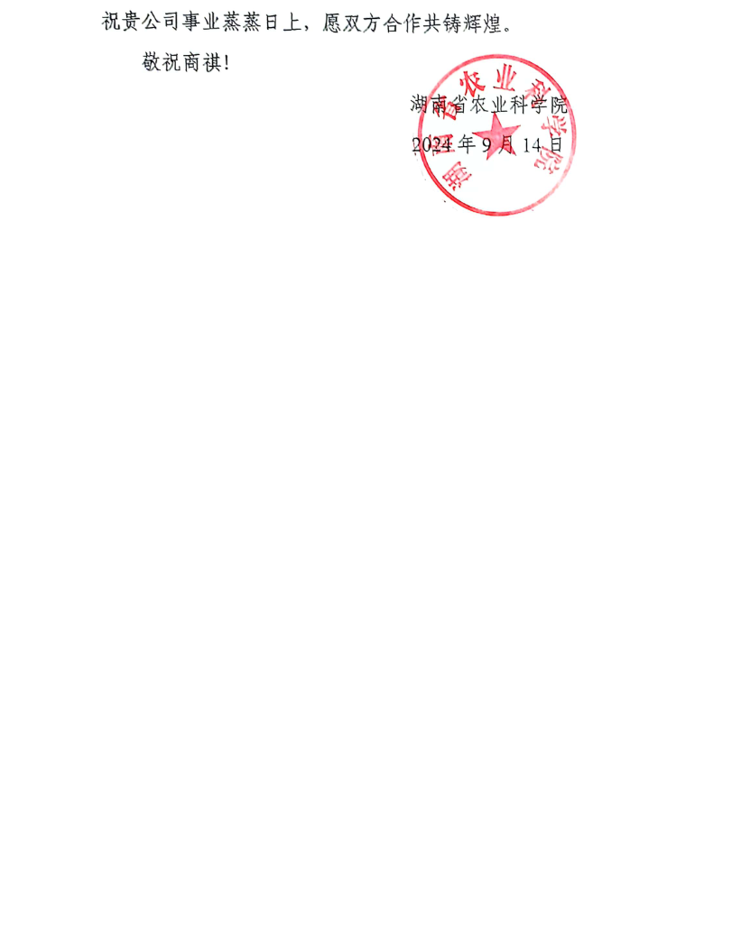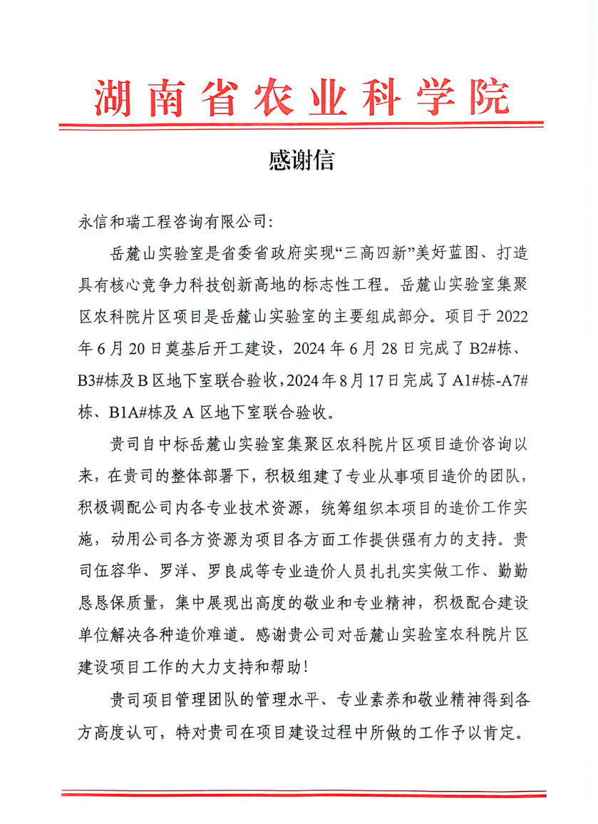 9.14日,湖南省農業科學院向公司發來感謝信,對公司在岳麓山實驗室集聚區農科院片區項目造價咨詢工作的出色表現給予了贊揚與肯定。